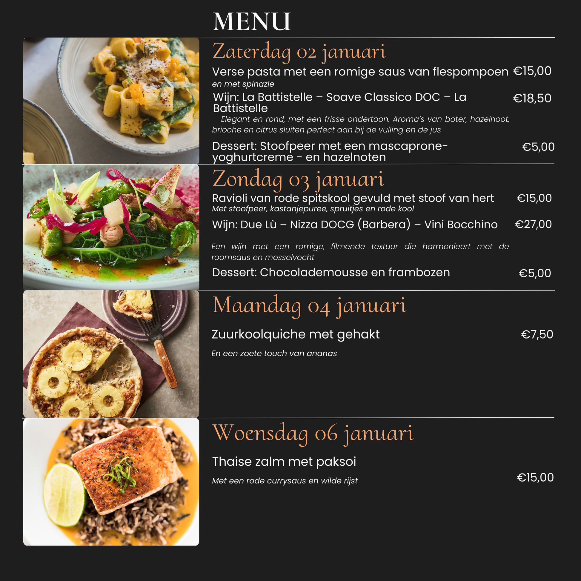 Geniet van een zorgvuldig samengesteld doordeweeks menu, bereid met verse ingrediënten en een vleugje Italiaanse finesse. Perfect voor drukke dagen waarop je toch wilt genieten van kwaliteit en smaak.